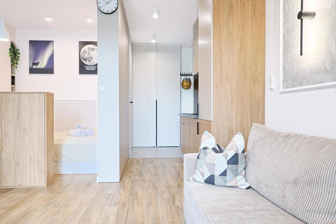 Apartament typu studio. This air-conditioned apartment consists of 1 living room, 1 separate bedroom and 1 bathroom with a shower. The well-fitted kitchenette features a stovetop, a refrigerator, a dishwasher and kitchenware. This apartment has a washing machine, a tea and coffee maker, a flat-screen TV and a balcony. The unit offers 2 beds. Apartament - 4 osobowy. Powierzchnia pokoju ok.: 28 mkw.